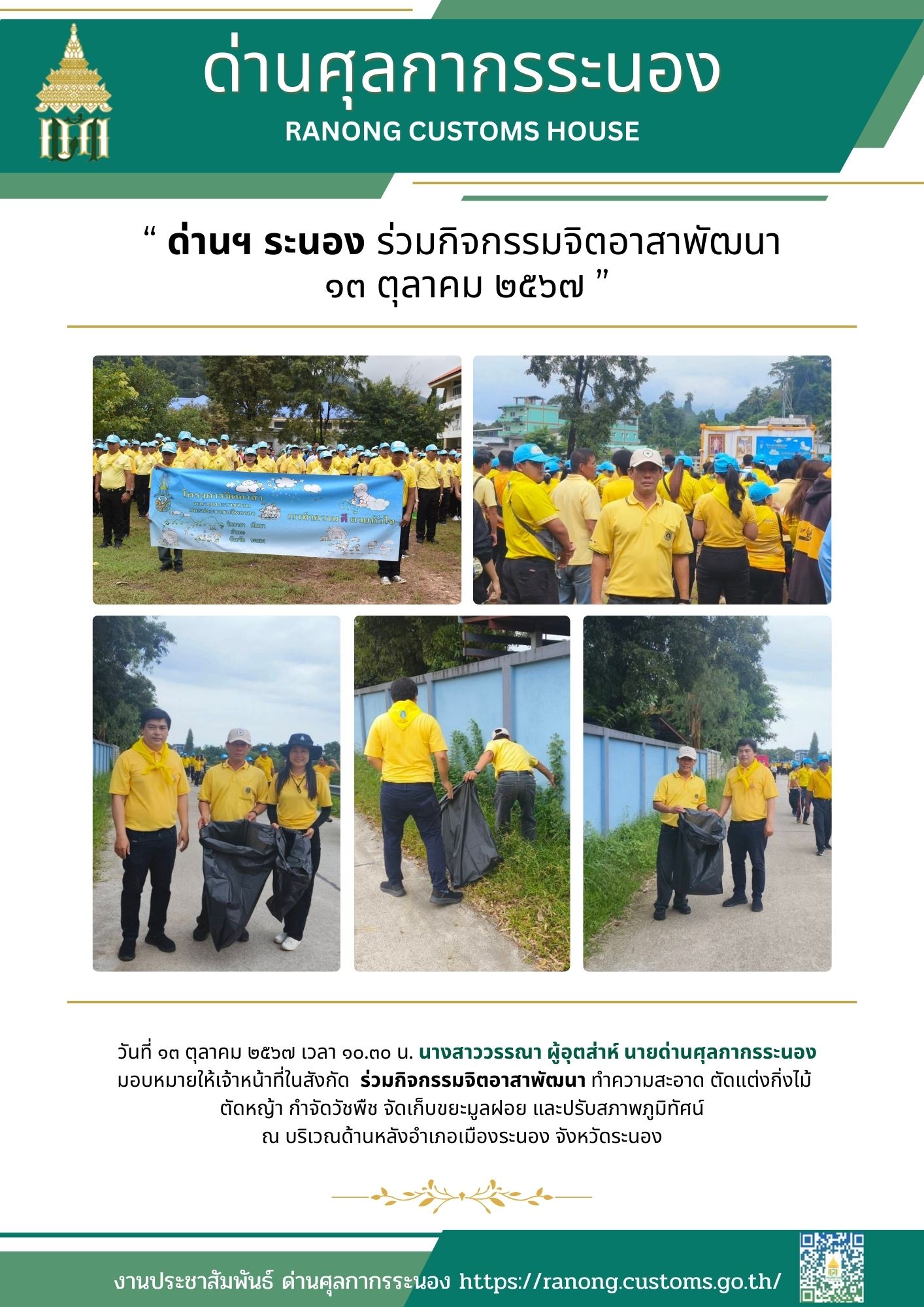 ด่านศุลกากรระนอง ร่วมกิจกรรมจิตอาสาพัฒนา ๑๓ ตุลาคม ๒๕๖๗