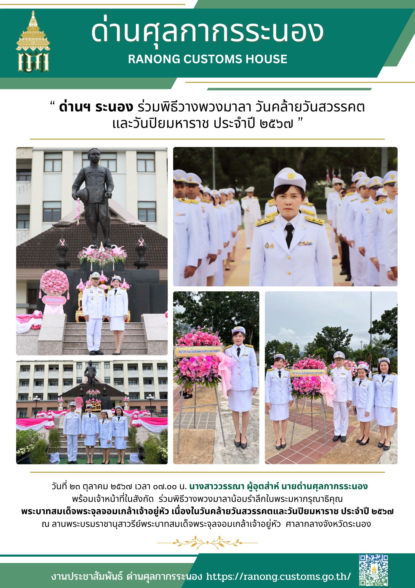 ด่านศุลกากรระนอง ร่วมพิธีวางพวงมาลา วันคล้ายวันสวรรคต และวันปิยมหาราช ประจำปี ๒๕๖๗