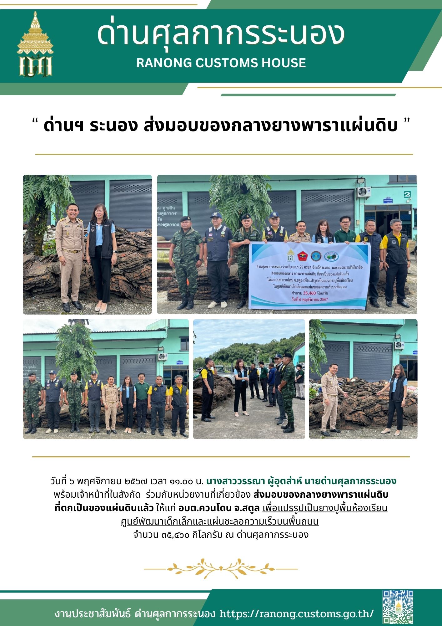 ด่านศุลกากรระนอง ส่งมอบของกลางยางพาราแผ่นดิบ