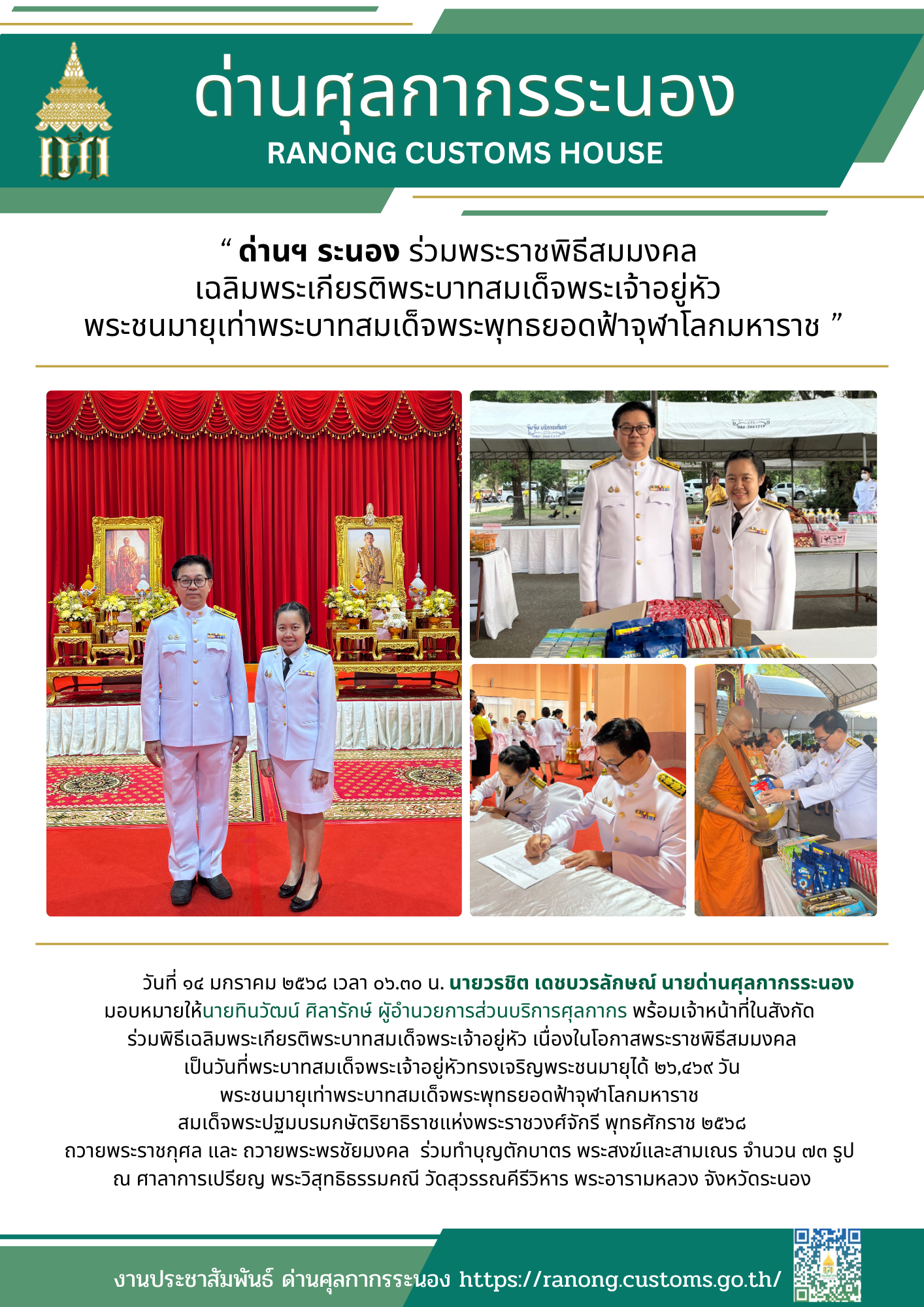 ด่านศุลกากรระนอง ร่วมพระราชพิธีสมมงคลเฉลิมพระเกียรติพระบาทสมเด็จพระเจ้าอยู่หัวพระชนมายุเท่าพระบาทสมเด็จพระพุทธยอดฟ้าจุฬาโลกมหาราช