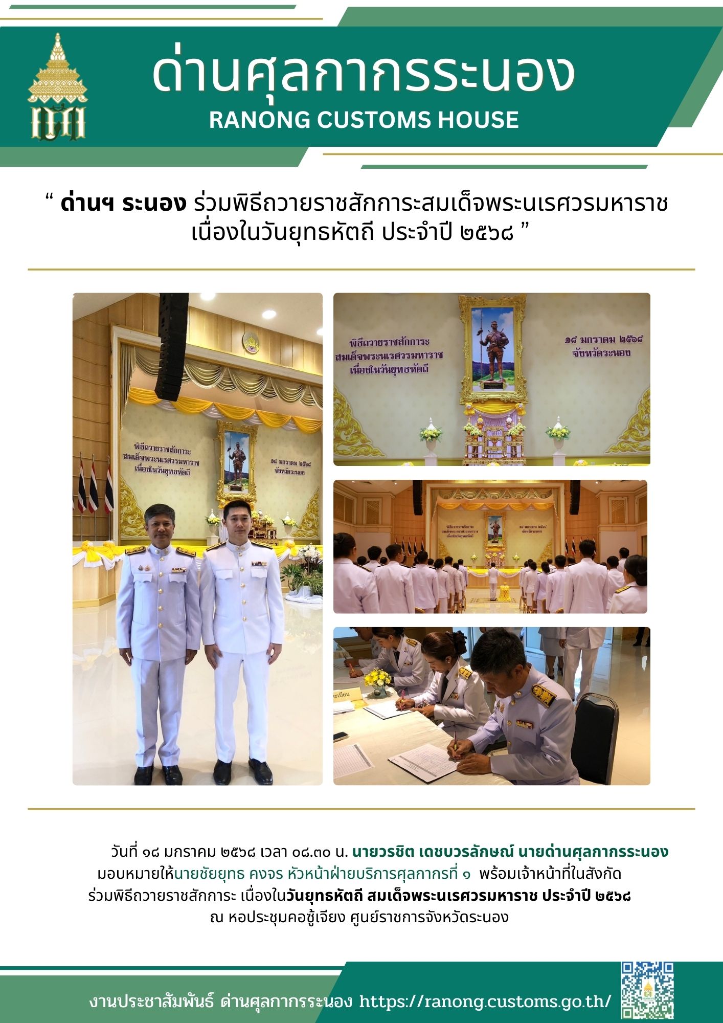 ด่านศุลกากรระนอง ร่วมพิธีถวายราชสักการะสมเด็จพระนเรศวรมหาราช เนื่องในวันยุทธหัตถี ประจำปี ๒๕๖๘