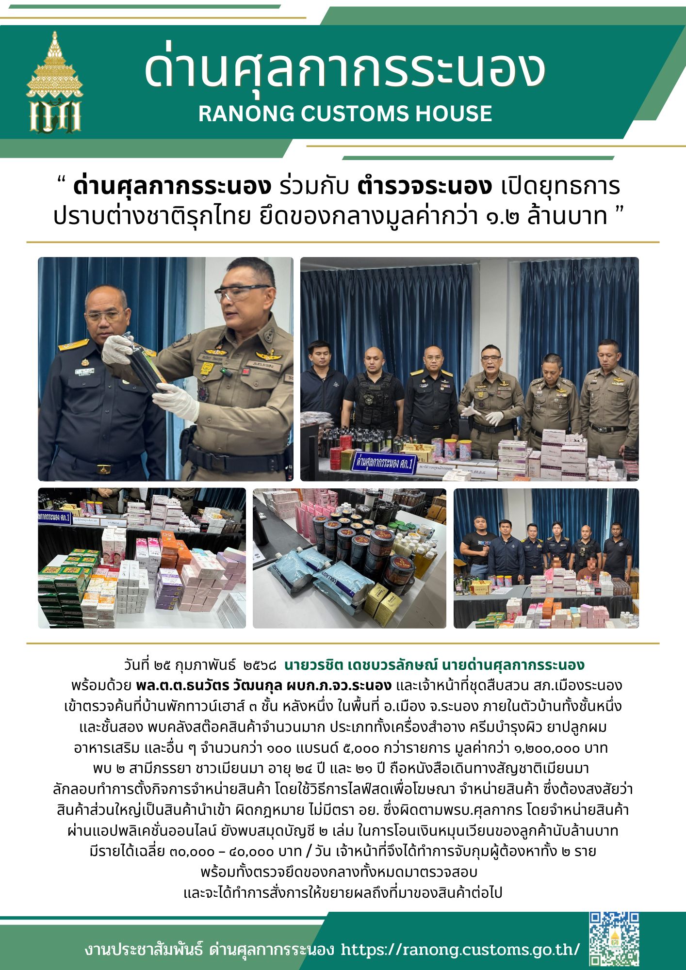 ด่านศุลกากรระนอง ร่วมกับ ตำรวจระนอง เปิดยุทธการ ปราบต่างชาติรุกไทย ยึดของกลางมูลค่ากว่า ๑.๒ ล้านบาท