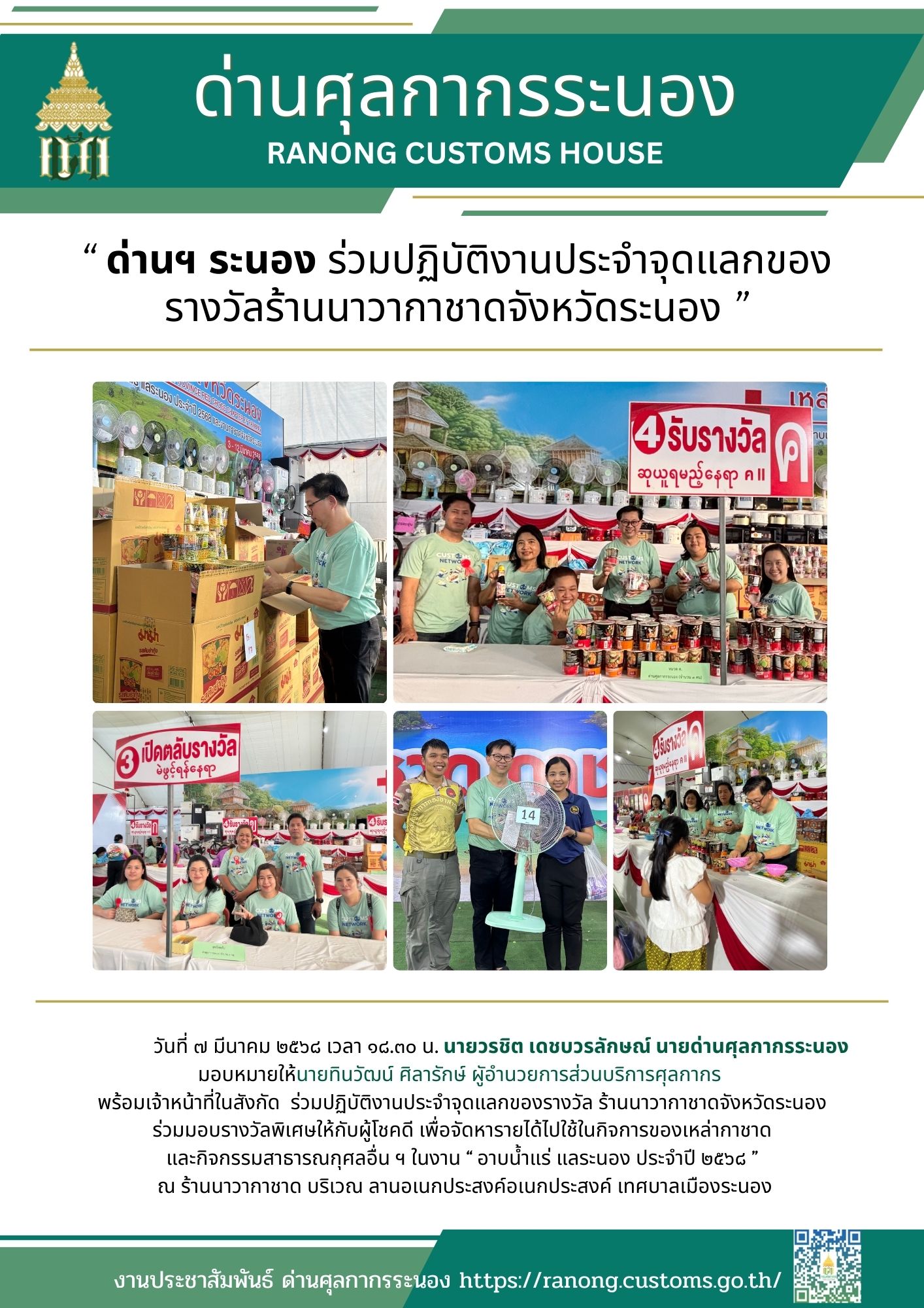 ด่านศุลกากรระนอง ร่วมปฏิบัติงานประจำจุดแลกของรางวัลร้านนาวากาชาดจังหวัดระนอง