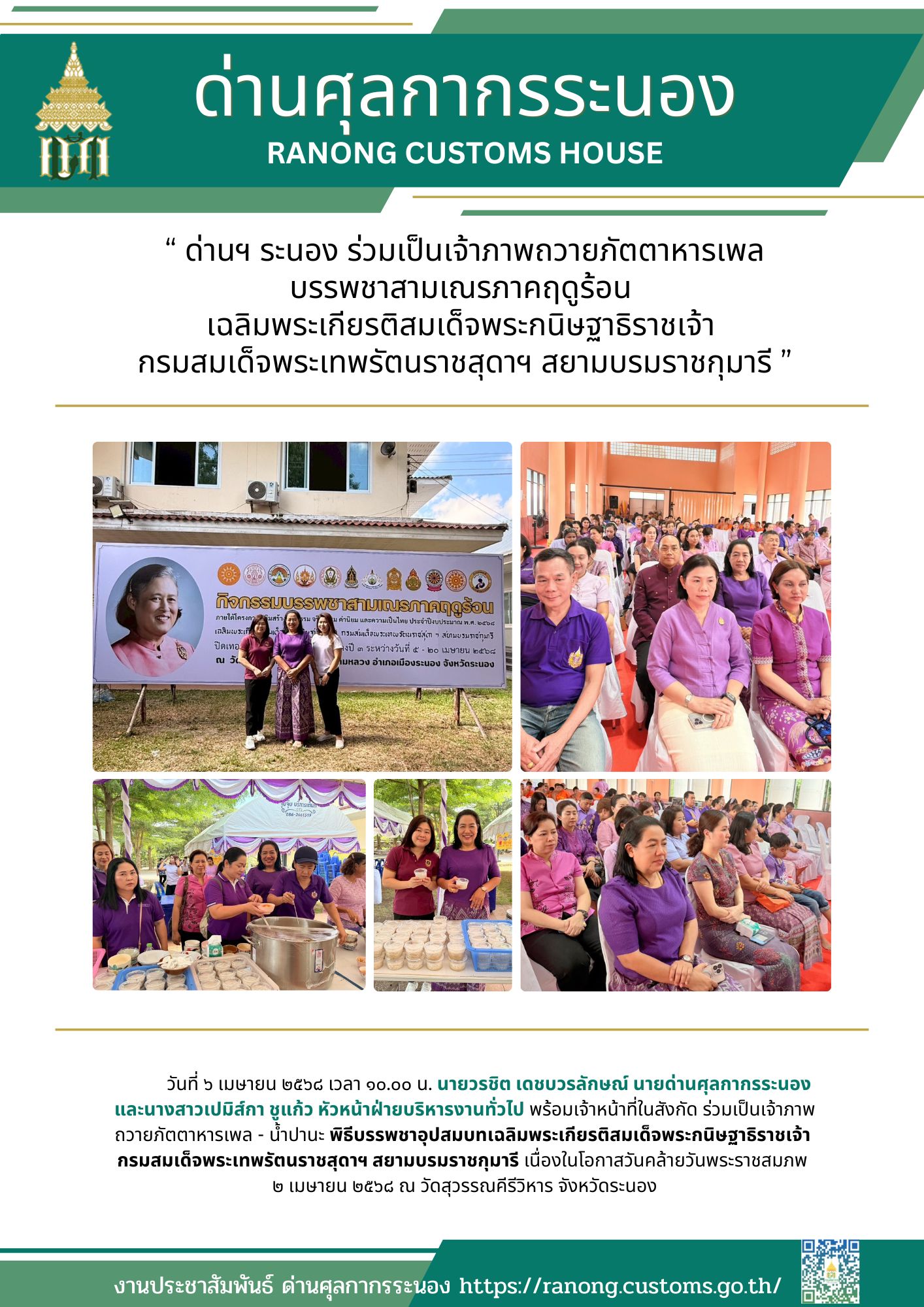 ด่านศุลกากรระนอง ร่วมเป็นเจ้าภาพถวายภัตตาหารเพล บรรพชาสามเณรภาคฤดูร้อน เฉลิมพระเกียรติสมเด็จพระกนิษฐาธิราชเจ้า กรมสมเด็จพระเทพรัตนราชสุดาฯ สยามบรมราชกุมารี