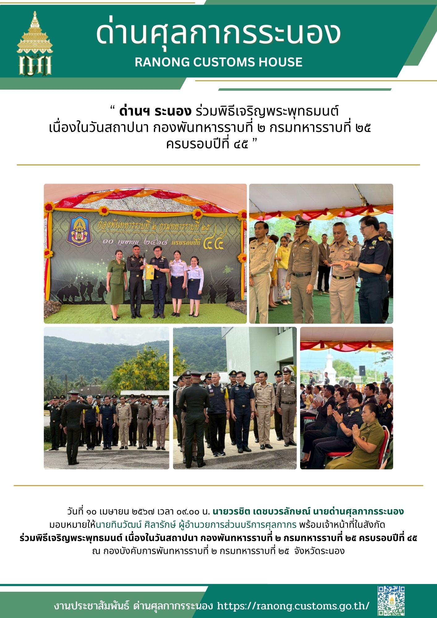 ด่านศุลกากรระนอง ร่วมพิธีเจริญพระพุทธมนต์ เนื่องในวันสถาปนา กองพันทหารราบที่ ๒ กรมทหารราบที่ ๒๕ ครบรอบปีที่ ๔๕