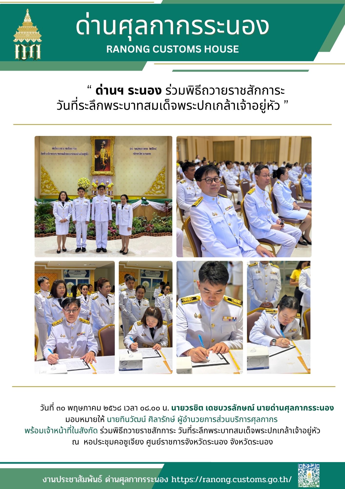 ด่านศุลกากรระนอง ร่วมพิธีถวายราชสักการะ วันที่ระลึกพระบาทสมเด็จพระปกเกล้าเจ้าอยู่หัว