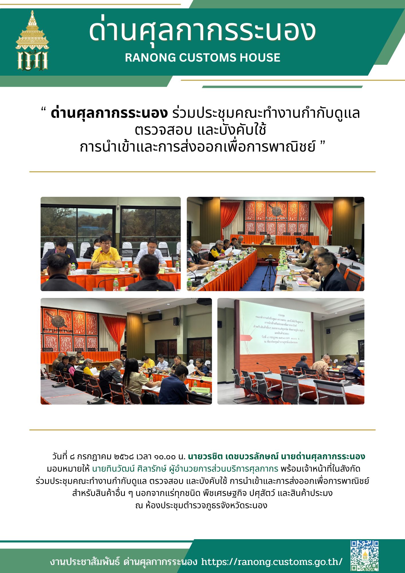 ด่านศุลกากรระนอง ร่วมประชุมคณะทำงานกำกับดูแล ตรวจสอบ และบังคับใช้ การนำเข้าและการส่งออกเพื่อการพาณิชย์