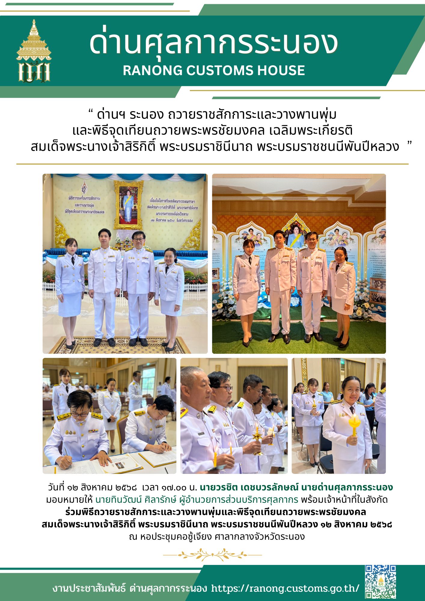 ด่านศุลกากรระนอง ถวายราชสักการะและวางพานพุ่ม และพิธีจุดเทียนถวายพระพรชัยมงคล เฉลิมพระเกียรติ สมเด็จพระนางเจ้าสิริกิติ์ พระบรมราชินีนาถ พระบรมราชชนนีพันปีหลวง