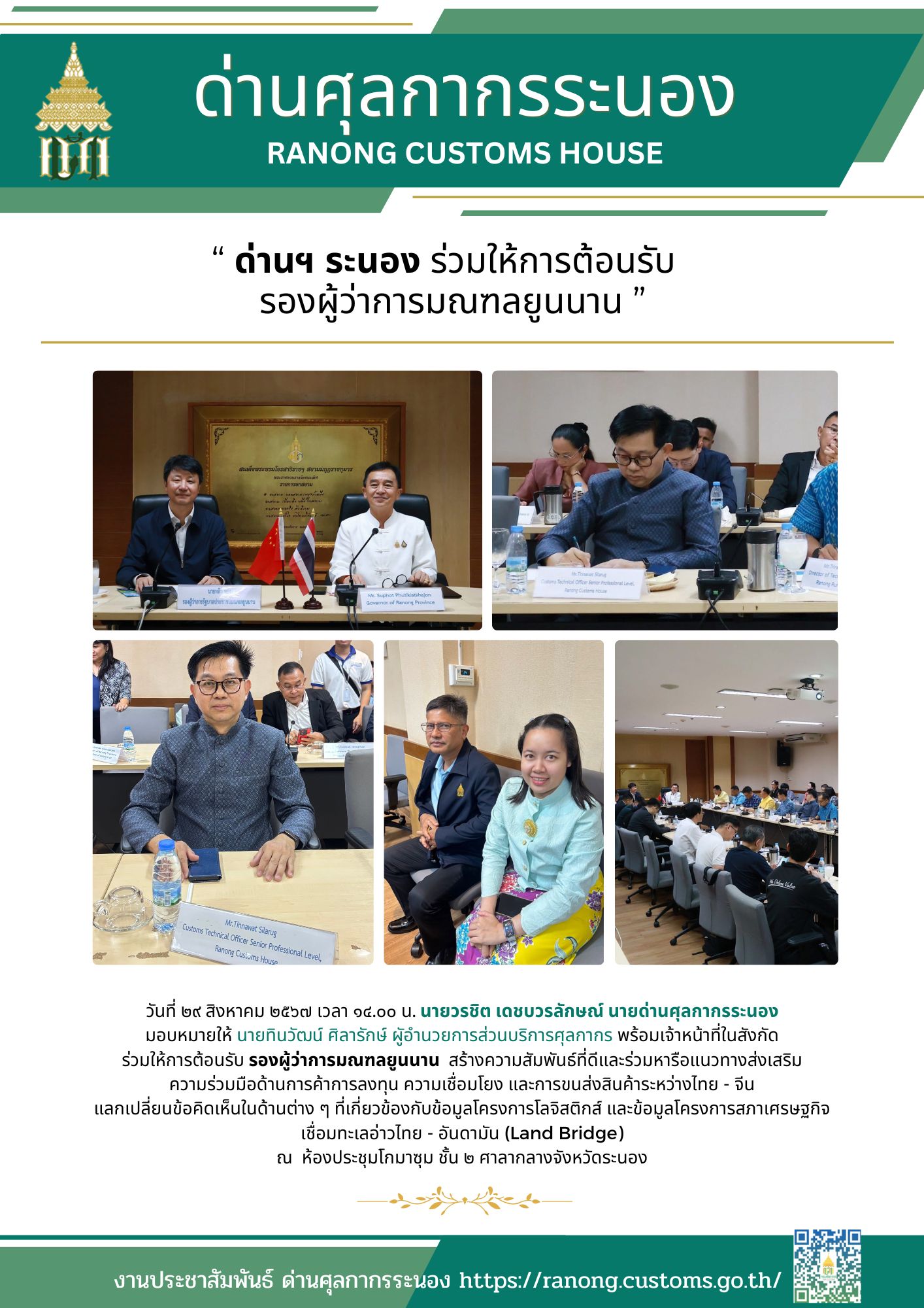 ด่านฯ ระนอง ร่วมให้การต้อนรับ รองผู้ว่าการมณฑลยูนนาน
