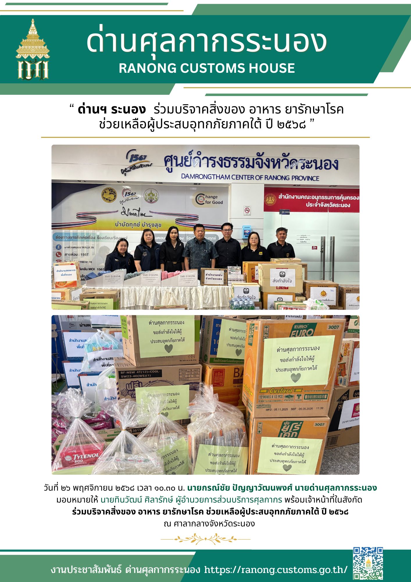 ด่านศุลกากรระนอง ร่วมบริจาคสิ่งของ อาหาร ยารักษาโรค ช่วยเหลือผู้ประสบอุทกภัยภาคใต้ ปี ๒๕๖๘