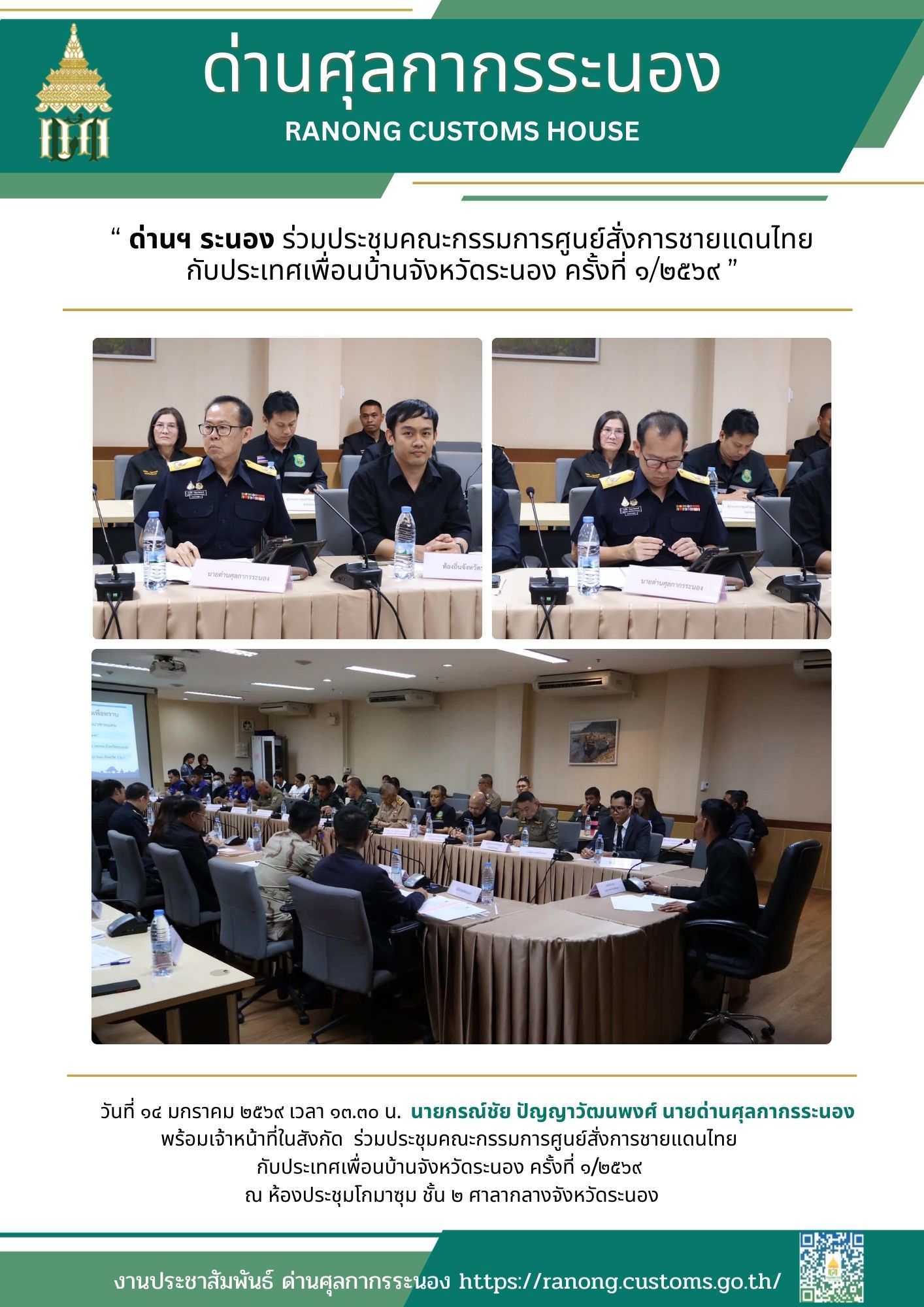 ด่านศุลกากรระนอง ร่วมประชุมคณะกรรมการศูนย์สั่งการชายแดนไทย กับประเทศเพื่อนบ้านจังหวัดระนอง ครั้งที่ ๑/๒๕๖๙